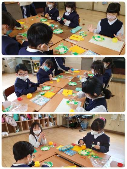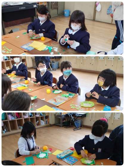 自分で選んだ色紙をちぎって葉っぱを作り、紙皿にのりでペタペタ。次にベルを折りました。そのベルとかわいいリボンをどこに貼るのか考えてお気に入りの場所に貼り付けました。かわいいリースのできあがり。今日お家に持って帰ります。