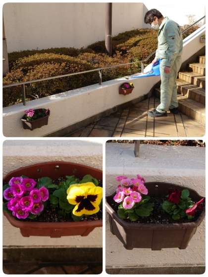 1月10日(火)は、3学期の始業式です。管理作業員さんが、玄関のプランターに花の苗を植えてくれました。玄関先がパッと明るくなりました。