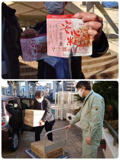 九条東地域活動協議会の杉村会長と九条東連合の災害救助部長の植田さまが、土曜日に実施する地域防災訓練と防災学習の時に子ども達や教職員にも災害時の非常食を知ってもらおうということで、わざわざ個包装のアルファ化米(五目ご飯)をたくさん持ってきてくださいました。土曜日に子ども達に持って帰ってもらう予定です。ご家庭でお子さんと一緒に作って食べてみてください。そして、災害時の避難の仕方や約束など、ご家族で確認してみてくださいね。