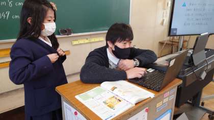 子どもがお家の都合でお休みした時には、Teamsを使ってオンラインで授業をしています。今日は、2年生の算数でオンライン授業をしていました。長さの学習を教室のみんなと一緒にしていました。お休みしていても子どもの顔を見てお話しできるので担任の先生も安心です。