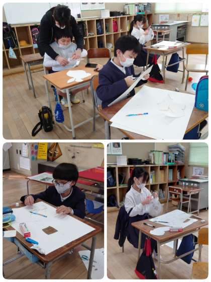 3年生は紙版画を作成中です。卯年にちなんで、画用紙でウサギを作っていました。いろんな動きのウサギがいます。3年生全員のウサギがそろったらにぎやかになりそうです。