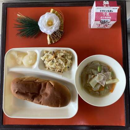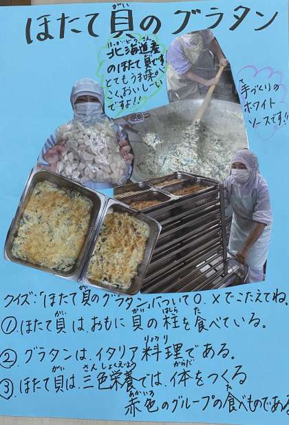今日の献立は、ほたて貝のグラタン、スープ、黒糖パン、牛乳でした。