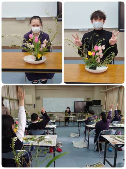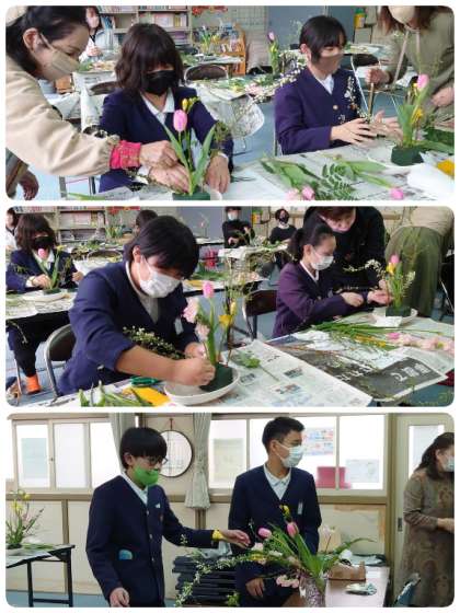 今日のお花は、「雪柳・チューリップ・フリージア・スィートピー・レザーファン」でした。お花を包んでいる新聞紙を外した時、「わぁ、かわいい!!」と声が上がりました。先生から、今日のお花の名前を教えてもらい、いけばな体験開始です。どのくらいの長さに切るのか、オアシスのどのあたりにお花を入れるのかなど、先生のいけ方を見ながら真剣な表情で取り組んでいました。