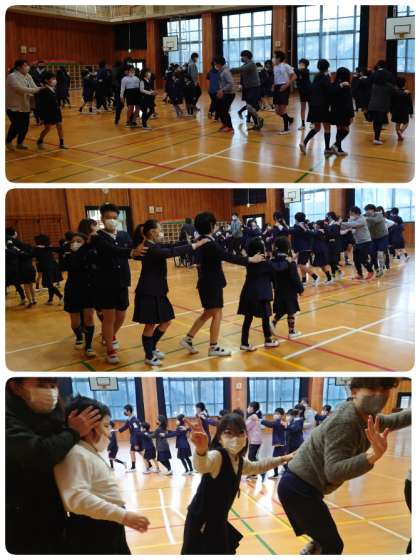 先生が弾くピアノに合わせて、1人列車の出発です。出会った子とジャンケンをして、勝った子の後ろにどんどん列がつながっていきました。先生も加わって、みんなとっても楽しそうに遊んでいました。最後には全校児童と先生達の長〜い列になりました。終わったときに自然に拍手がわきあがりました。子ども達の楽しそうな笑顔が最高の児童集会になりました。