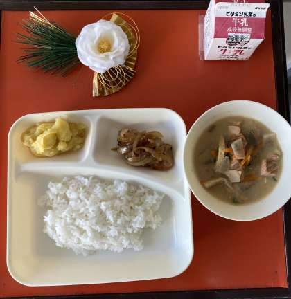 今日の献立は、鶏肉の甘辛焼き、かす汁、くりきんとん、ごはん、牛乳でした。