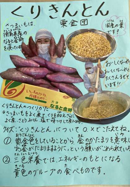 給食では、さつまいも(なると金時)をゆで、栗(水煮)を入れ、砂糖、みりん、塩で味つけをして、煮含め、練り上げます。