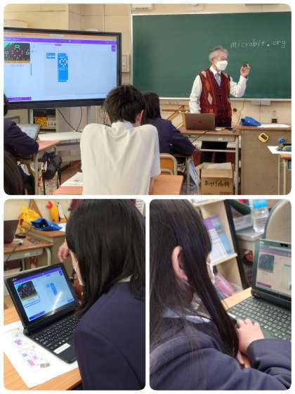 5・6時間目、大阪公立大学工業高等専門学校の知能情報コースで指導されている土井 智晴教授に来ていただき、プログラミングを教えてもらいました。学習では、マイクロビット(micro:bit)という教育用の小型コンピューターボードを使って学習しました。子ども達は、土井先生のお話を聞きながら、どんどん基本的な使い方を理解していきました。