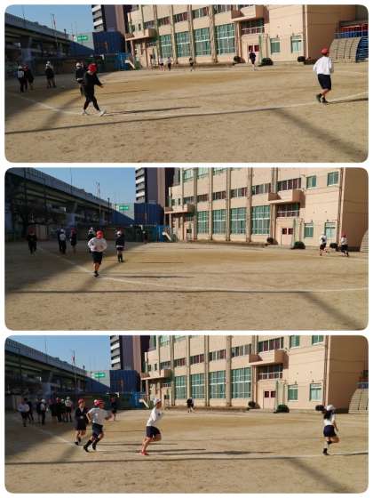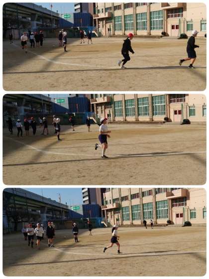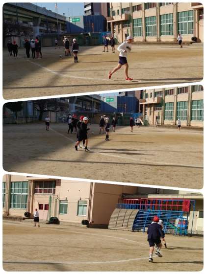 運動場から楽しそうな曲が聞こえてくるので見に行くと、6年生が体育の学習で持久走をがんばっていました。みんなそれぞれ自分のペースで走っていました。他の学年もこれからしばらくの間持久走をすると思いますが、だんだん走る距離が伸びていくと思います。寒い中ですが、しっかり体力をつけてほしいと思います。