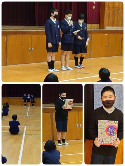 続いて、図書委員の子どもが本の紹介をしました。今日紹介してくれた本は「チャレンジミッケ ミッケがだいすき」でした。子ども同士でおすすめの本を紹介し合い、いろんなジャンルの本にふれてほしいと思います。