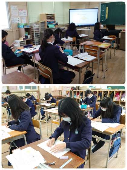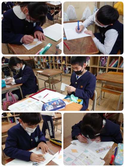 対角線が8cmと4cmのひし形の面積の求め方について考えていました。図に書き込みをしたり、はさみで切ったりしながら、自分で考えた方法を式に表しました。4つの三角形にして考える子、2つの三角形にして考える子、平行四辺形や長方形にして考える子など、いろいろな方法を考えていました。