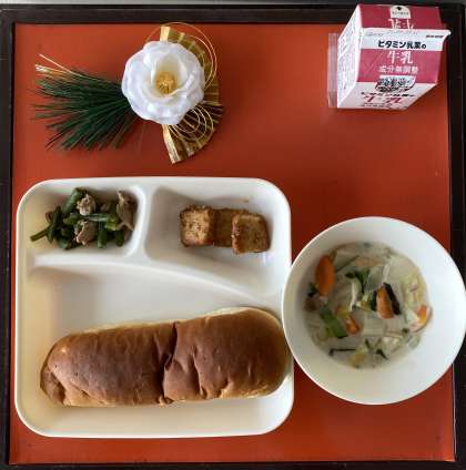 今日の献立は、はくさいのクリーム煮、あつあげのごまじょうゆかけ、豚肉とさんどまめのオイスターソースいため、おさつパン、牛乳でした。