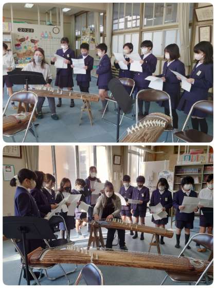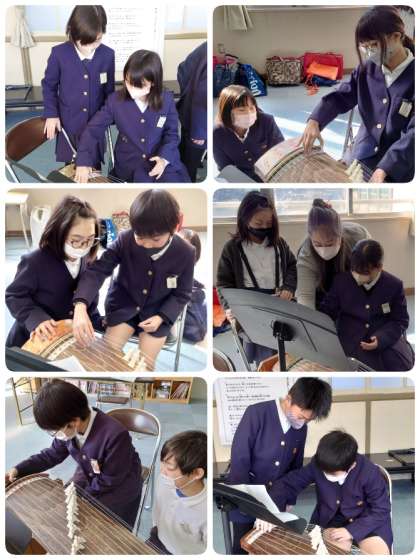 4年生の出前授業で、西区社会福祉協議会のボランティア・市民活動センターに登録をされている「筝曲隊 心音(ここね)」の赤阪 惠美子先生と大戸 志浦先生に来ていただきました。4年生の音楽の学習で「筝(琴)」について学習するので、昨年度から指導に来ていただいています。