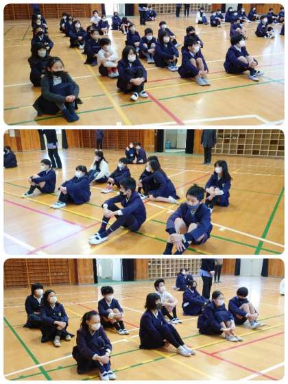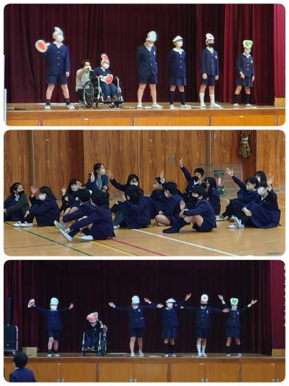 それから、みんなで「ドラえもんえいようのうた」を歌いました。「ドラえもんえいようのうた」には、1番に赤、2番に黄、3番に緑のグループの食べものが出てきて、それぞれの働きがよくわかります。給食委員の子ども達は歌に出てくる食べ物が描いてあるうちわやお面をつけて舞台の上で大きな声で歌ってみんなをリードしていました。
