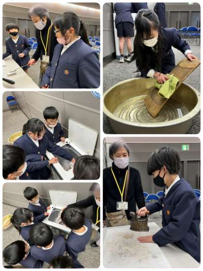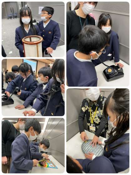 まずは、昔の道具の体験です。黒電話・洗濯機・炊飯器などを実際にさわって、どのように使っていたか考えました。