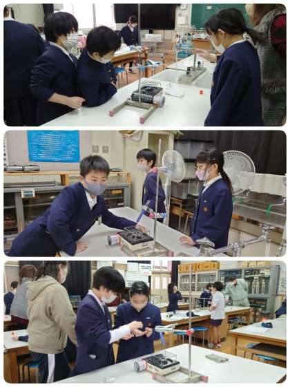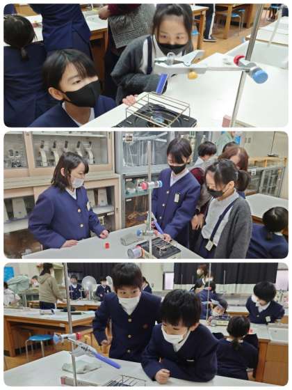 3時間目に理科の公開授業を行いました。単元は「もののあたたまり方」です。前の学習で、金属の温まり方について実験しました。今日は水の温まり方です。試験管に水を入れて熱し、水はどのように温まっていくかを調べました。温度の変化がよく分かるようにサーモインクを加えました。サーモインクは青色ですが、温まるとピンクに変化します。