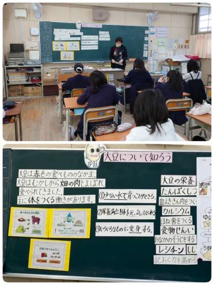 1.大豆のチカラ 2.大豆の栄養 3.大豆のへんしん について学習しました。大豆は赤色の仲間で、昔から畑の肉と呼ばれており、主に体をつくる働きがあります。