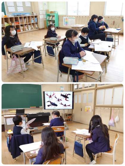 図画工作の時間にザリガニの紙版画を作成し始めました。まず、画用紙にザリガニの頭・胴体・しっぽの部分を描きました。次にはさみで切り取ってから、画用紙を重ねて貼っていきます。みんなで育てているザリガニの写真を見ながら形を作っていきます。大きな爪をつけたり動きを工夫したりすると迫力が出てくると思います。どんな版画ができあがるのか楽しみです。
