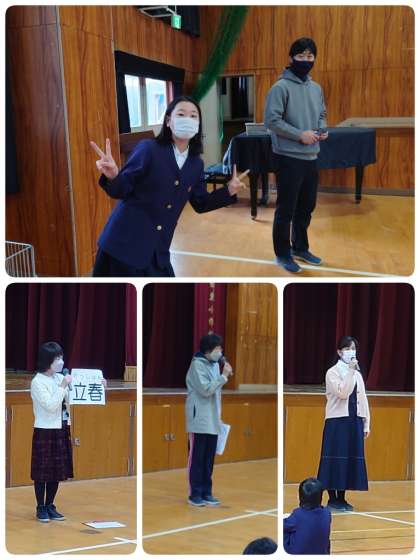 今日の児童朝会では、「節分」「立春」とサクラの「花芽」と「葉芽」についてお話をしました。まだまだ寒い日が続きますが、暦の上では春。学校の桜の木の枝先の芽が少しずつふくらんできています。サクラの芽には花になる花芽(はなめ)と葉っぱになる葉芽(ようが)の2種類あります。形が少し違うので、どんどん芽が大きくなってきたら違いが分かると思います。これからいろいろなところで小さい春を見つけることができるようになります。子ども達が、自分達のまわりの自然に興味をもって観察をしたり調べ学習をしたりして、自然の変化に気づいてほしいと思っています。