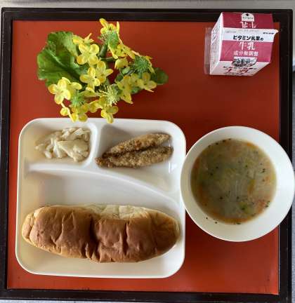 今日の献立は、わかさぎフライ、コーンとはくさいのスープ、カリフラワーのサラダ、おさつパン、牛乳でした。