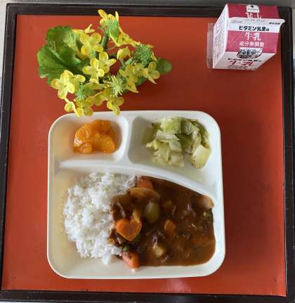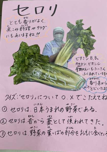教室で、「何の花かなー」と聞くと、たまねぎ、パセリ、バジルなどの声があがりましたが、「セロリやで、ハヤシライスのルーに入っているよ」と言うと、セロリをあまり好きでない人も、「わからへんかった。」「これなら食べれるね」とにっこり。子どもたちに人気の献立です。