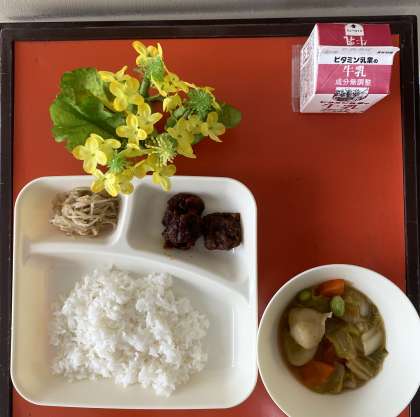 今日の献立は、くじらのオーロラ煮、まる天と野菜のうま煮、もやしのピリ辛あえ、ごはん、牛乳でした。