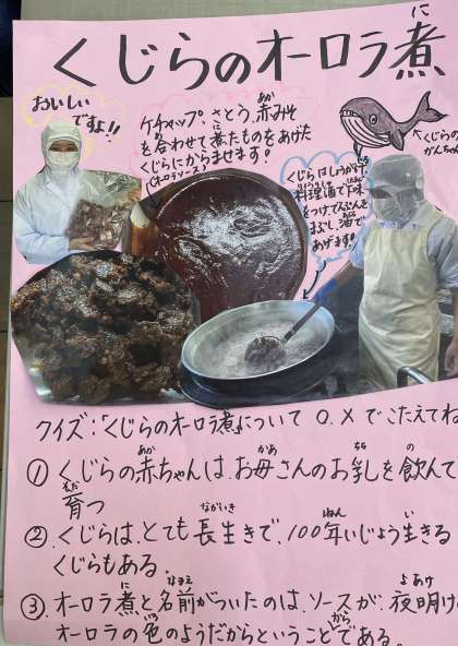 今日の給食の「くじらのオーロラ煮」は、しょうが、料理酒で下味をつけ、でん粉をまぶして油で揚げたくじらに、ケチャップ、砂糖、赤みそで作ったオーロラソースでからめています。