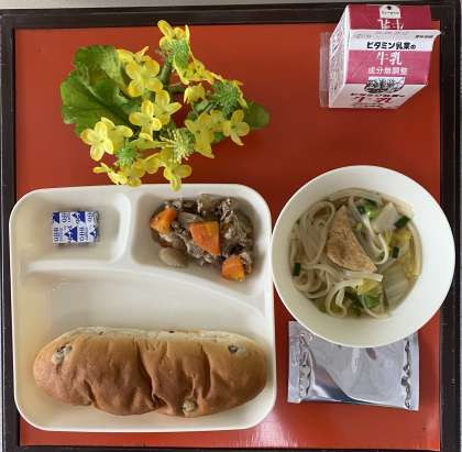今日の献立は、豚肉とごぼうの煮もの、なにわうどん、固形チーズ、レーズンパン、牛乳でした。