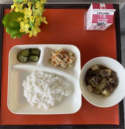 今日の献立は、すき焼き煮、もやしとささみのいためもの、きゅうりのゆず風味、ごはん、牛乳でした。