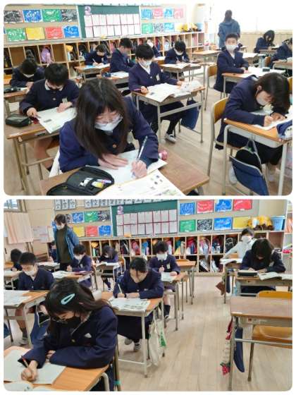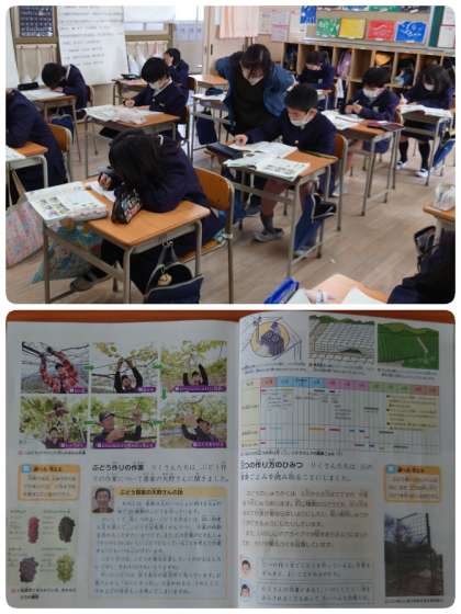 社会科の時間に、大阪府柏原市のぶどうづくりについて学習していました。収穫までの間にどのような作業をしているのか、写真や資料、動画を見ながら考えました。働く人たちの苦労やみんなにおいしいと言ってもらえる品質の良いぶどうを作りたいという思いなどに気づくことができました。
