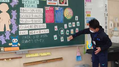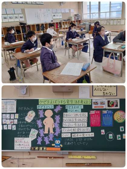 今日は3年生の栄養学習がありました。学習したのは「かぜをよぼうする食生活を考えよう」です。風邪を予防するためには、