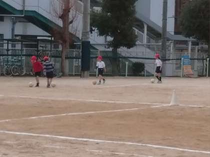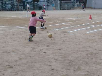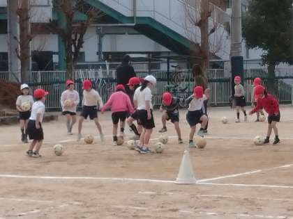 今日は、ボールを蹴ったりドリブルをしたりして、うまく足でボールを操れるように運動しました。