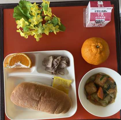 今日の献立は、豚肉のオイスターソース焼き、あつあげと野菜の中華煮、デコポン、コッペパン、アプリコットジャム、牛乳でした。