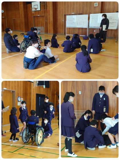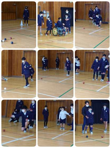 1時間目のなかよしタイムに【「東っこワールドカップ」ボッチャゲームをしよう】の公開授業を行いました。4チームに分かれ、仲間と協力しながらボッチャを楽しみました。ルールを確認してさっそくゲーム開始。ジャックボールの近くにボールが止まるように、投げる位置やスピードを考えて慎重に投げていました。