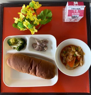 今日の献立は、鶏肉のバジル焼き、ウインナーと野菜のケチャップ煮、ブロッコリーのサラダ、黒糖パン、牛乳でした。