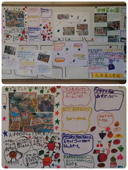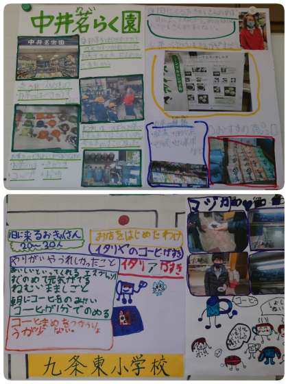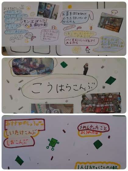 2年生がキララ九条商店街へ校外学習に出かけた後に、調べてきたことを発表するためにまとめたものです。学習参観ではこの発表をお家の人に見てもらいました。八百屋さん・パン屋さん・昆布屋さん・お茶屋さん・コーヒー屋さんにインタビューしたことを分かりやすくまとめてあります。各お店のおすすめ商品や、お店の人達の思いも書いてあるので、これを読むと今度買ってみようかなという気持ちになりました。