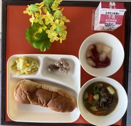 今日の献立は、フライドチキン、カレーシチュー[米粉]、キャベツとコーンのサラダ、フルーツゼリーおさつパン、牛乳でした。