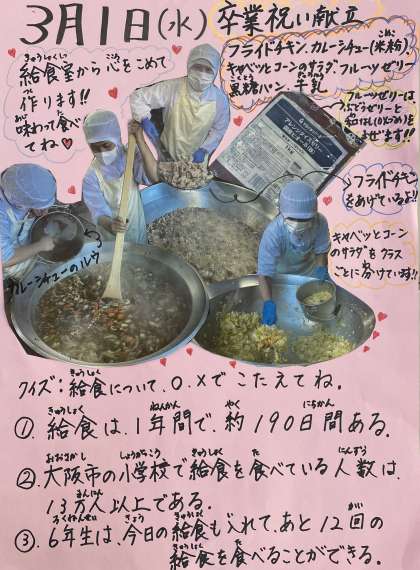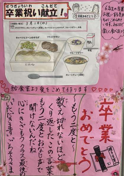 今日の給食は、卒業祝い献立です。今日も入れて、6年生は給食を食べる回数は12回です。