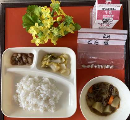 今日は、和食の献立でした。給食では、豆を使った献立は多いですが、とら豆の煮ものは煮えやすく、粘りがあるため、煮豆にするとおいしい豆です。