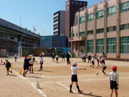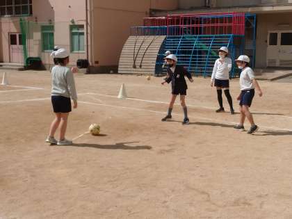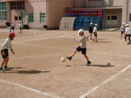 今日も、音楽に合わせてボールけりゲームの練習をしたり、試合をしたりしました。
