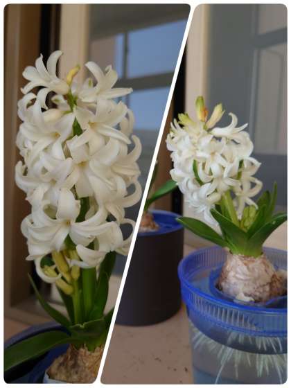 3色目のヒヤシンスが咲きました。今回は白色。これでピンク・紫・白の3色のヒヤシンスが満開になりました。ヒヤシンスの青葉のような、爽やかで、そして甘い香りが広がっています。