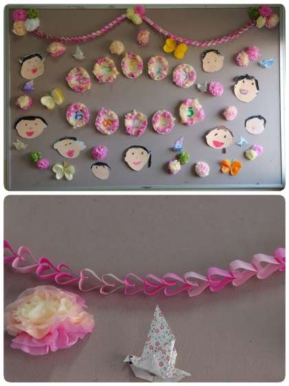写真の掲示物は1年生が作りました。ハートの輪飾りもかわいいです。