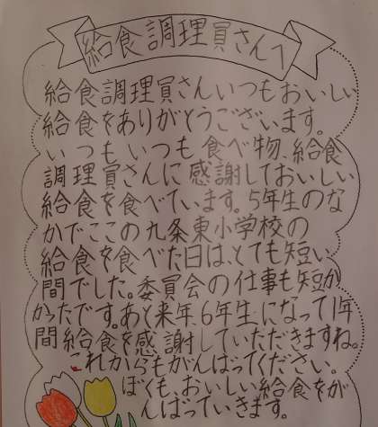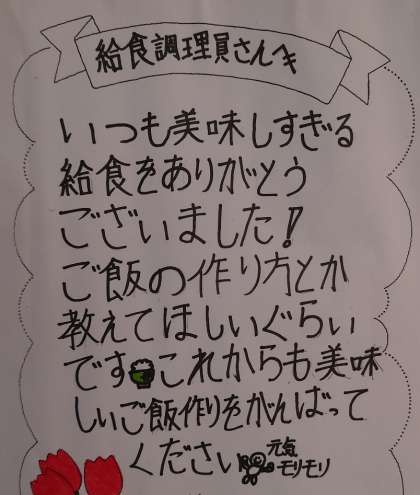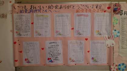 1年間の締めくくりに、給食委員の子ども達からいつもおいしい給食を作ってくださる調理員さんへありがとうのメッセージです。