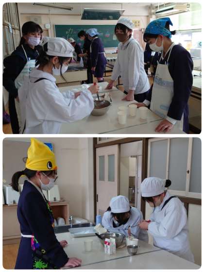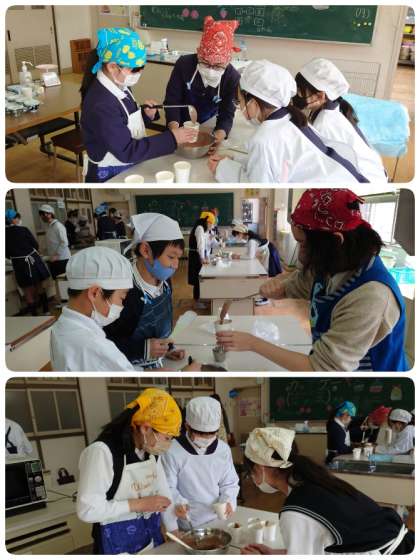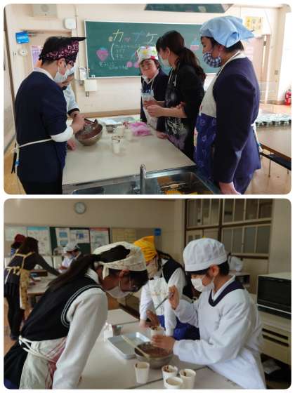 料理・さいほうクラブでは、カップケーキを作っていました。まずホットケーキミックスにココアパウダーと水を入れてよく混ぜました。それを紙コップに入れて、電子レンジでチン。あっという間にカップケーキのできあがりです。最後にカラースプレーやホイップで飾りつけをしました。大満足の笑顔でパクパク食べていました。