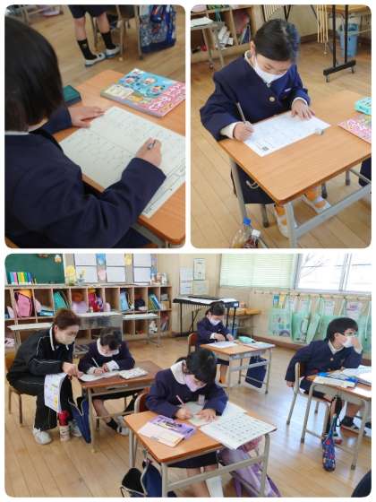 3時間目に教室を回ると、1・2・3年生は漢字の復習や算数のまとめのテストをしていました。漢字がなかなか思い出せなくてプリントとにらめっこしている子がいました。cmをmmに、mをcmにする問題で困っている子もいました。ヒントを少し出すとすぐに思い出すことができましたが、今年度も残すところあとわずかです。基礎学力が定着するように毎日がんばります。