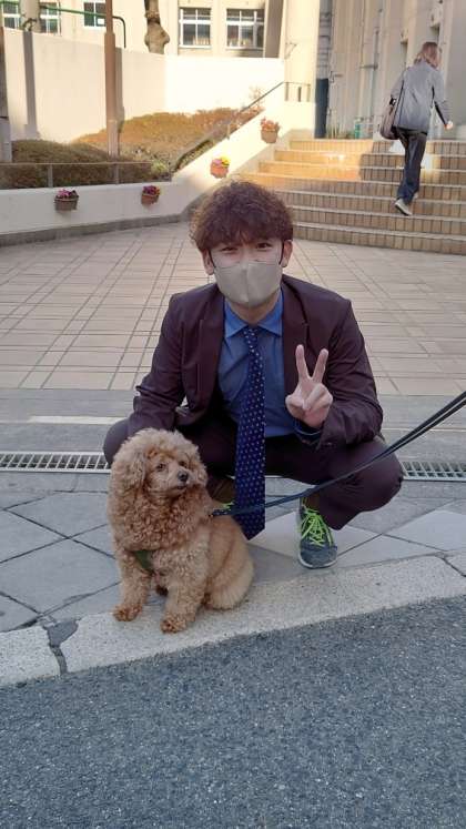 次のお客様は、かわいいわんちゃん。お母さんが犬の散歩をしながら、6年生のお子さんと一緒に学校まで来てくださいました。ふわふわでとってもかわいいわんちゃんで、玄関で登校の見守りをしていた6年生の担任と一緒にパチリ。「先生、よく似てる。」と...。ふわふわの髪型とかわいい雰囲気がそっくりでした。