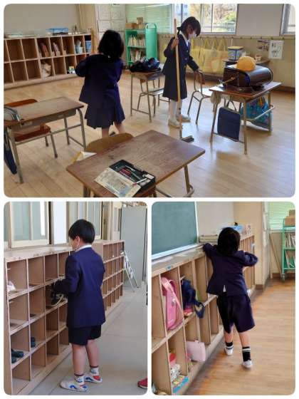 今日は大掃除。1年間お世話になった教室を中心に、廊下等のお掃除をしました。教室のすみっこ等、普段忘れがちなところの物をのけて一生けんめいにお掃除しました。