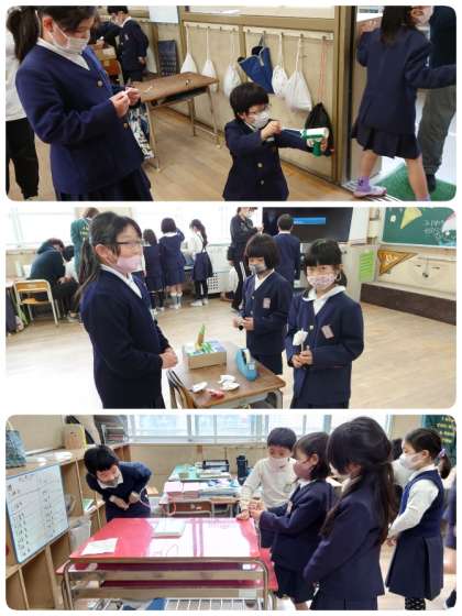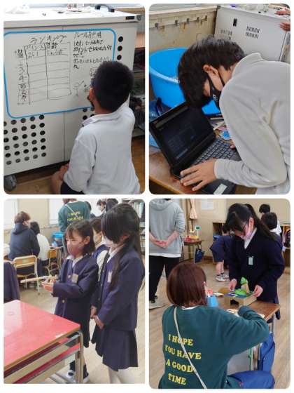 3時間目に、3年生が作ったおもちゃランドに1・2年生が招待してもらって、楽しく遊びました。おもちゃランドには、「ミニサッカー」「的あてっぽう」「めいろ」「しゃてき」「さかなつり」のコーナーがありました。