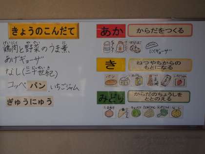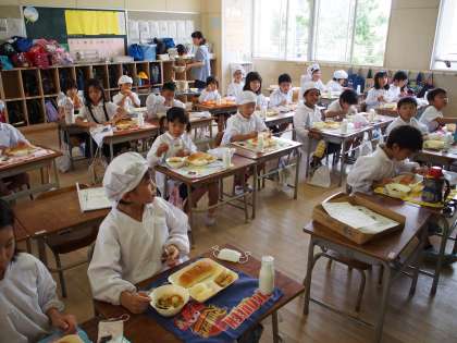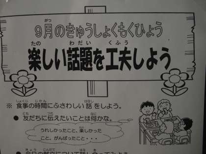今日から給食が始まりました。学級のみんなでいっしょに食事をしながら、夏休みのことや2学期の行事について、楽しく語り合いました。学校給食は栄養だけでなく、食事のマナーを身につけていく場でもあります。