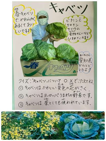 キャベツはビタミンC(100g中44mg)を多く含んでいます。特に、春キャベツはやわらかく甘みがあり、生で食べるとおいしく、スープに入れてもおいしいですね。