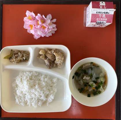 今日の献立は、鶏肉のからあげ、中華スープ、チンゲンサイともやしの甘酢あえ、ごはん、牛乳でした。